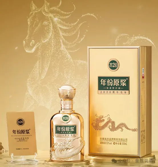 古井贡酒古井贡·年份原浆 20 马年生肖酒(下图)瓶身为标志性盘龙玉玺瓶,产品主色“流光金”,取自汗血天马之光采其皮毛似绸缎,周身流转金色光芒汉武帝得此神骏,特设金马门遂有“玉堂金马”以彰壮志。