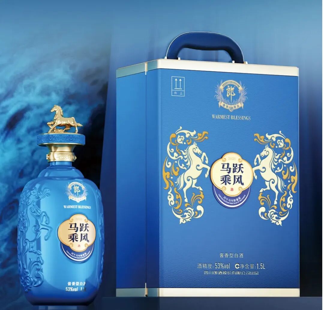 马跃乘风·丙午马年限量版(下图)融合郎酒酿造匠心与传统生肖文化,以生肖马为主题,以新锐蓝色为主色调,寓意奋进通达、前程万里是郎酒高端奢香藏品系列的小批量勾调、限量典藏之作。