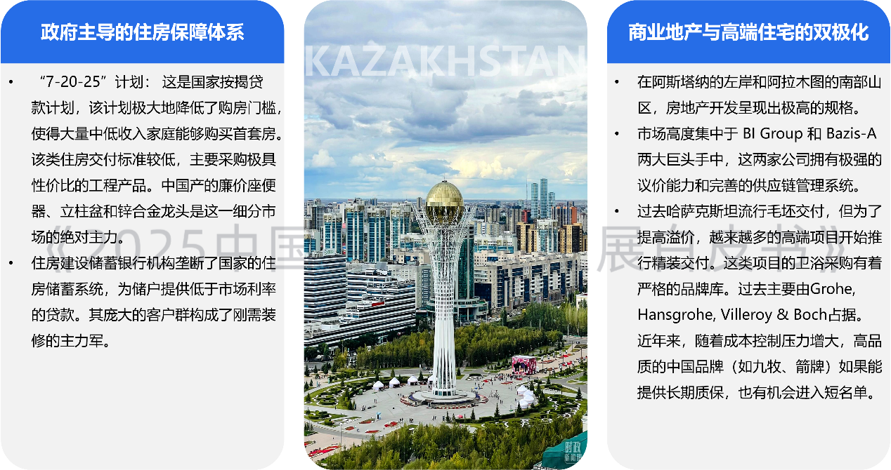 哈萨克斯坦的卫浴市场需求,约65%源自新房交付与二手房翻新。理解房地产市场的运作逻辑,是预测卫浴销量的关键。哈萨克斯坦目前的房地产市场主要分为以下两大层面: