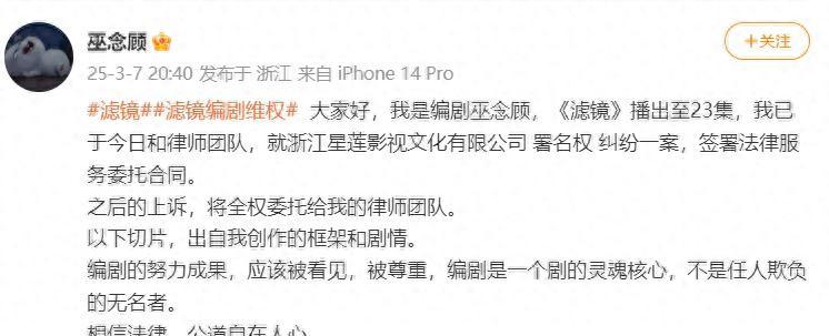 巫念顾这人也是个较真的,为了这事儿还找了律师团队,说要打官司上诉,非得把这个署名权给争回来不可。他说编剧是一个剧的灵魂核心,不是任人欺负的无名者,这话说的挺有气势。不过我寻思着,这官司打起来也挺麻烦的,证据取证什么的都不容易,而且就算赢了官司拿到署名权,这剧都播完了再加上名还有啥意思啊。