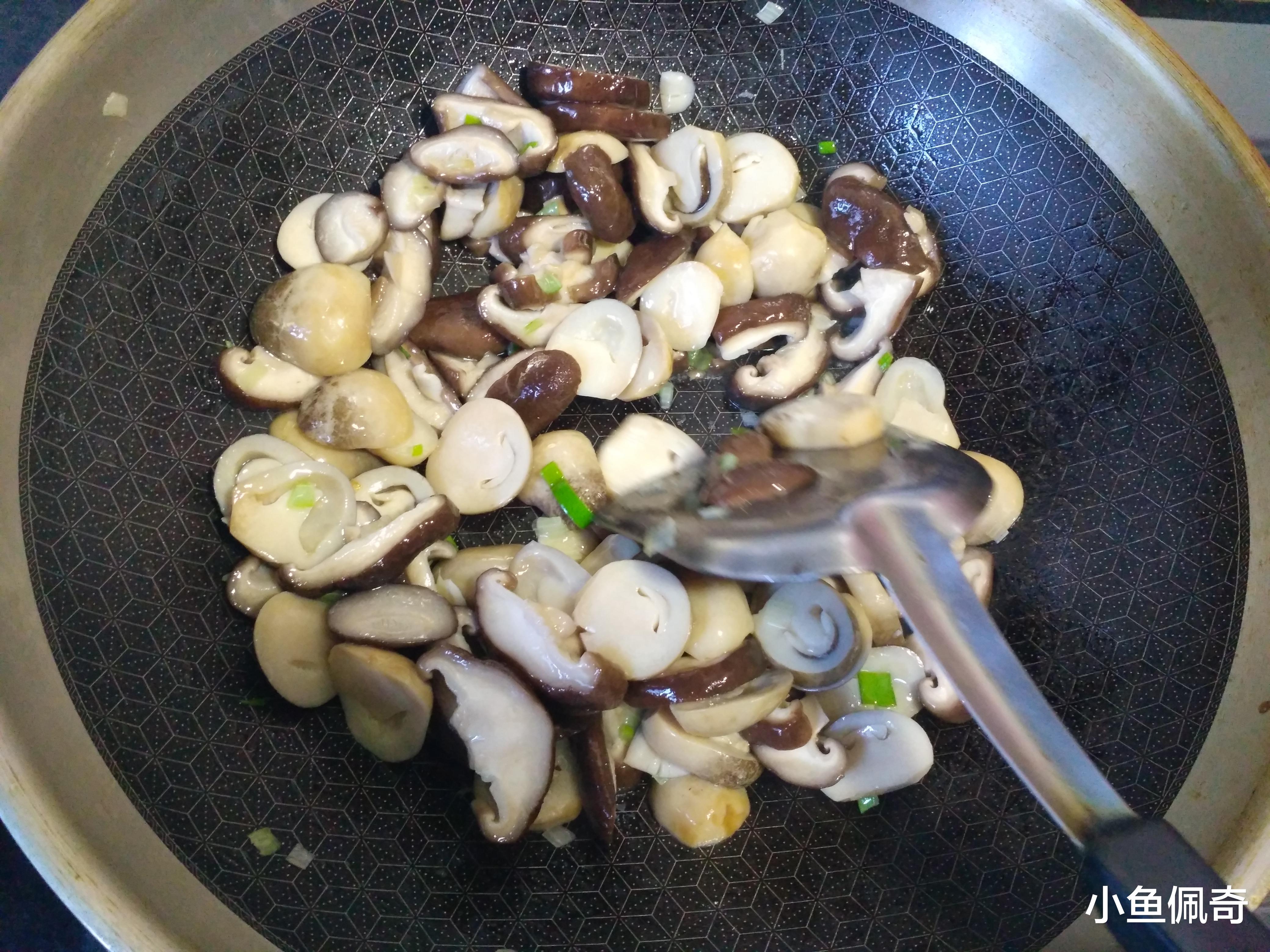 3.热油爆香:取一平底锅置于火上预热至五成热,倒入适量食用油,待油温升至六成热时先下入蒜末、葱花爆香,接着依次加入肉丁、菌菇片快速翻炒均匀,直至肉丁变色、菌菇出水为止。