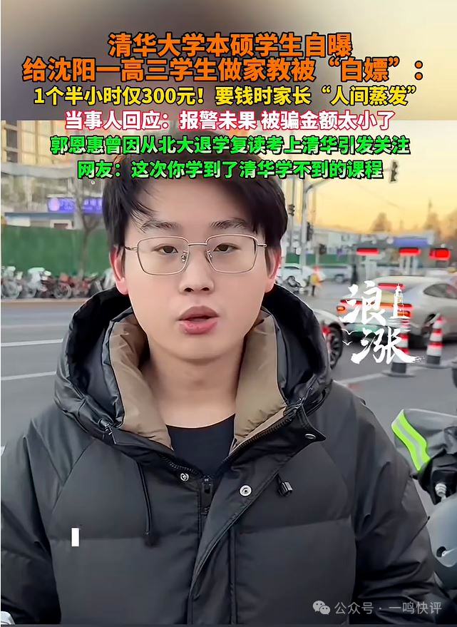 近日清华学霸兼职家教被白嫖300元课时费引发网上热议。作为一位初中学生的家长,笔者深知补课费的贵。虽然上面三令五申不让违规补课,但是对于家长来说, 有时是不得不花这个“冤枉钱”,奈何每个家长都想望子成龙。现如今,不少高校学生也利用课余时间“卷”进了教培这个行当。这其中不乏头部的985高校学生。对于大学生利用自己的“一技之长”赚点钱本是无可厚非的,其实不少大学生的家境并不富裕,能利用业余时间赚点钱也是给家庭减轻一些经济压力。同时通过补课这种社会行为也算是一种社会历练,对于后续毕业步入职场积累社会经验。但是往往这种教培行为都是双方私下商定好价格,约定好地方,而且不少都是补完课才给付钱。也正是这种私下交易、先补课后付钱的模式让不少大学生被骗——辛辛苦苦补完课,要么“甲方”以各种理由拒绝支付补课费或者要求“打折扣”,要么干脆不给钱直接“跑路”。近日清华大学某本硕郭同学自曝给某地一高三学生做数学家教辅导被“白嫖”:据郭同学说,此前某地一位家长主动联系到他,随后约定辅导费为 300 元 / 90分钟。郭同学称,该价格已低于其实际市场价值(因其清华背景),但家长最初曾要求150元,经讨价还价后达成一致。至于这个价格算贵还是便宜,这其实并不重要。既然是双方约定好的,说明这是彼此都可以接受的价格。首次辅导完课后,郭同学察觉这名学生学习心态不够踏实,便打算结清课时费后不再辅导。可该家长却就此失联,既不回消息也不接电话,似乎从“人间蒸发”一般。