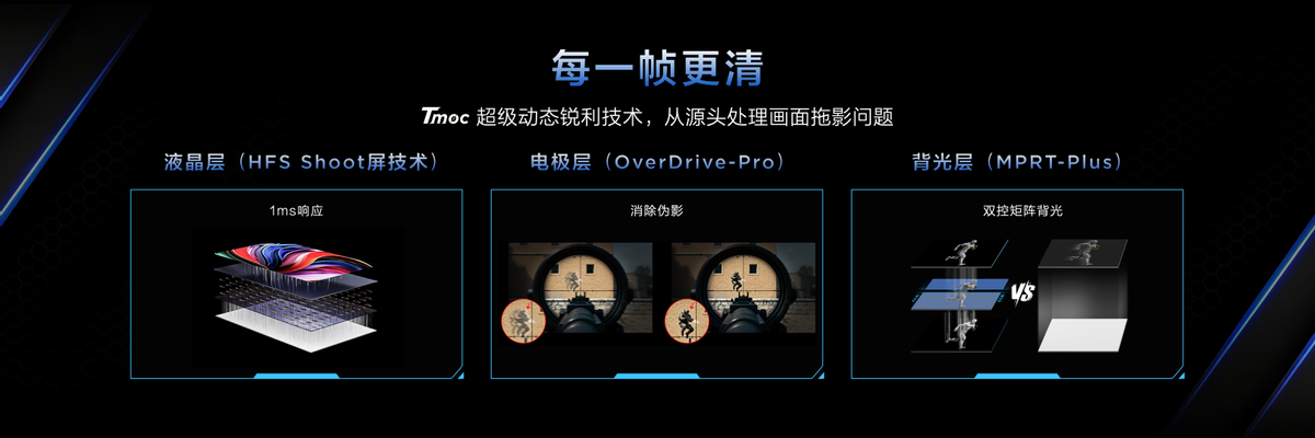 但要高速画面下画面拖影、撕裂不解决,那就是有超高刷都没用,TCL也是意识到了这一点,所以它专门给C3A Pro配置了Tmoc超级动态锐利技术,整合了HFS Shoot、OD Pro、MPRT-PLUS好几项技术,几乎能把高速画面的拖影和残像全消除。其中HFS Shoot技术能加快液晶分子的偏转速度,就算超高刷新率状态下,画面也依旧清晰,不会撕裂;OD Pro技术能避免传统过驱动带来的伪影,保证画面细节不缺失;MPRT-PLUS技术则能进一步扫清拖影,实现0.2ms的灰阶响应时间。除此之外,全链路低延迟控制在5ms以内,操作指令和屏幕画面几乎同步,即使在专业电竞场景下时,也不会出现卡顿、延迟的情况,操作手感直接拉满,竞技时更有优势。