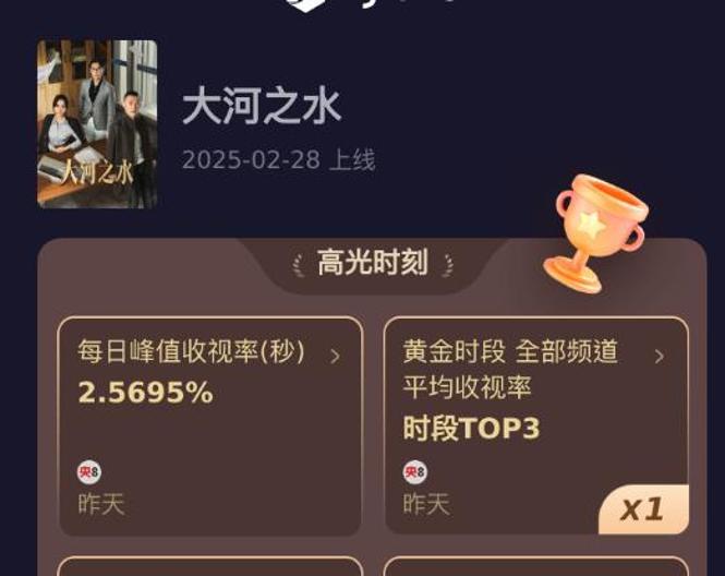 没错,央视总能把那些看起来不太受欢迎的作品炒成爆款。这不,《六姊妹》之后的新剧一播出就火了。这部叫《大河之水》的剧在中央八套上线,第一天就放了两集,收视率直接飙到2.5以上,真是厉害啊。