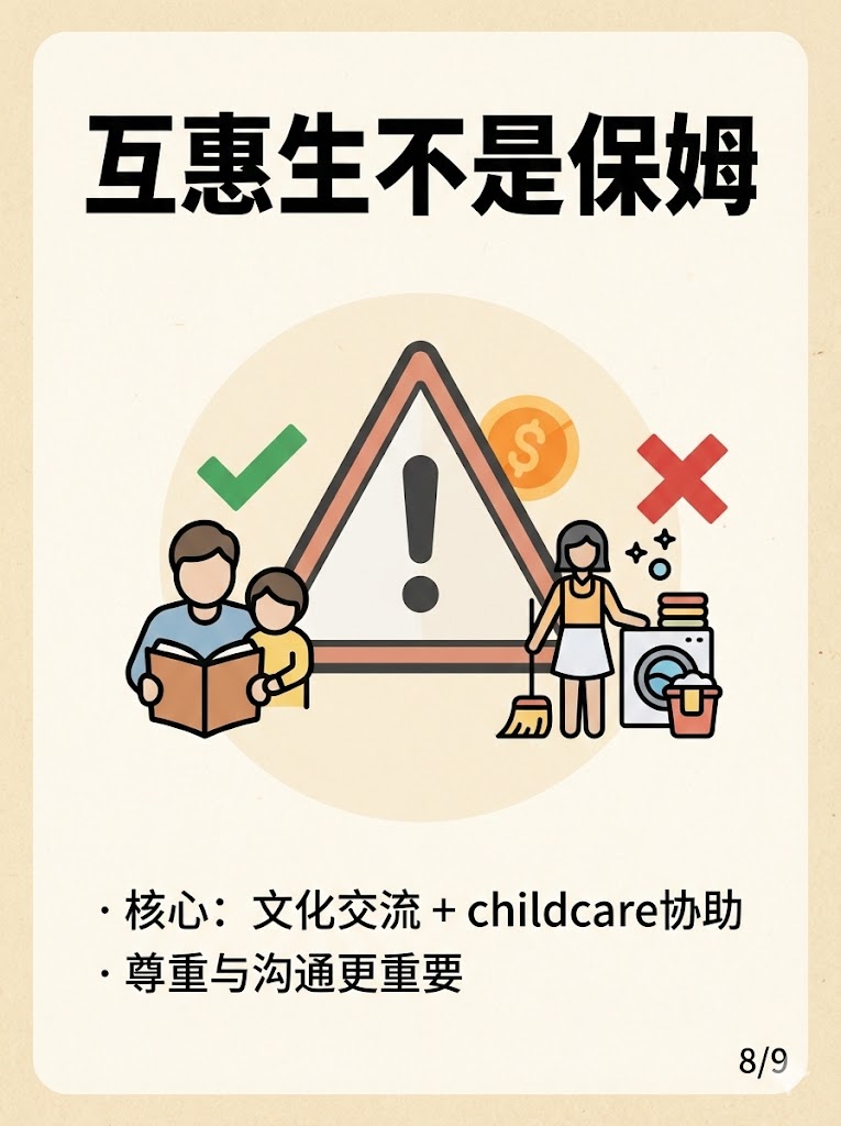 互惠生核心是文化交流与 childcare 协助。家庭要愿意提供尊重、边界与沟通机制;否则再好的互惠生也会不适配。