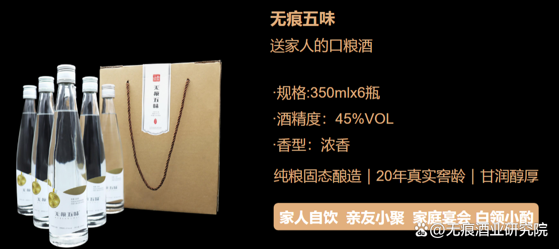 从口粮酒到高定酒的全场景覆盖无痕的产品体系以“纯粮固态酿造”为统一标准,根据场景与需求划分为多个系列: 日常饮用系列如“无痕五味”,以45%VOL浓香型酒体主打家庭自饮与亲友小聚,20年窖龄赋予其“甘润醇厚”的口感,适配白领小酌与家庭宴会场景。