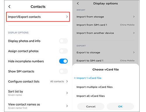 步骤 5. 现在,您可以打开Android设备上的“联系人”应用,然后依次进入“设置”>“导入/导出联系人”>“从存储导入”>“导入 vCard 文件”。不同Android手机品牌的显示界面可能略有不同。