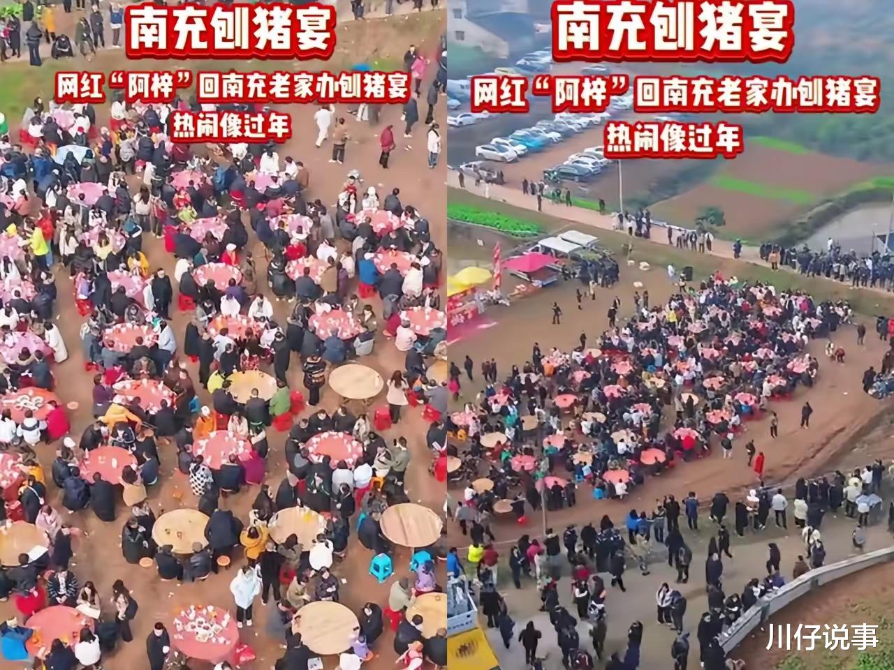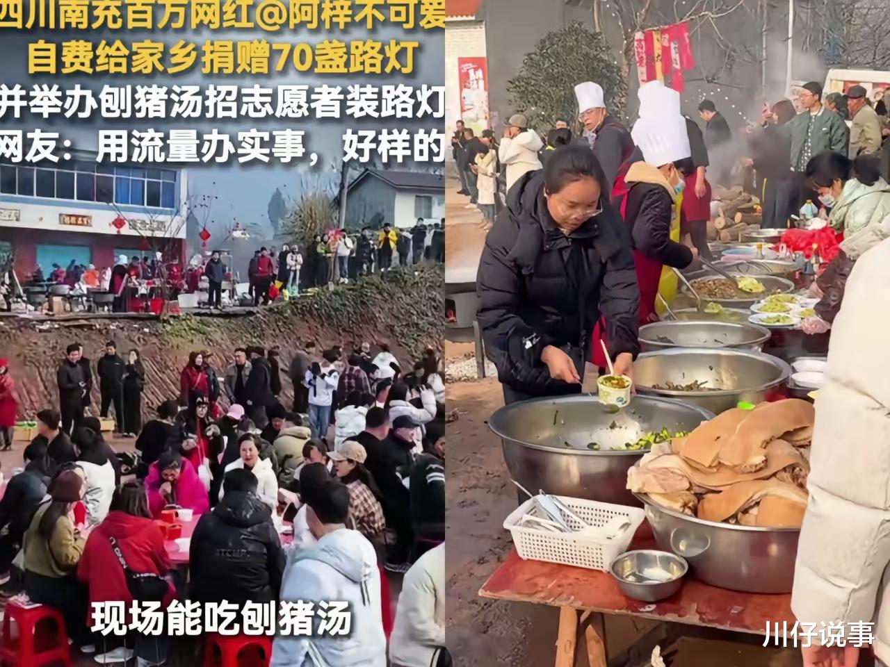 四川百万网红阿梓复制呆呆请吃刨猪宴,现场人山人海,并给村里捐赠70盏灯