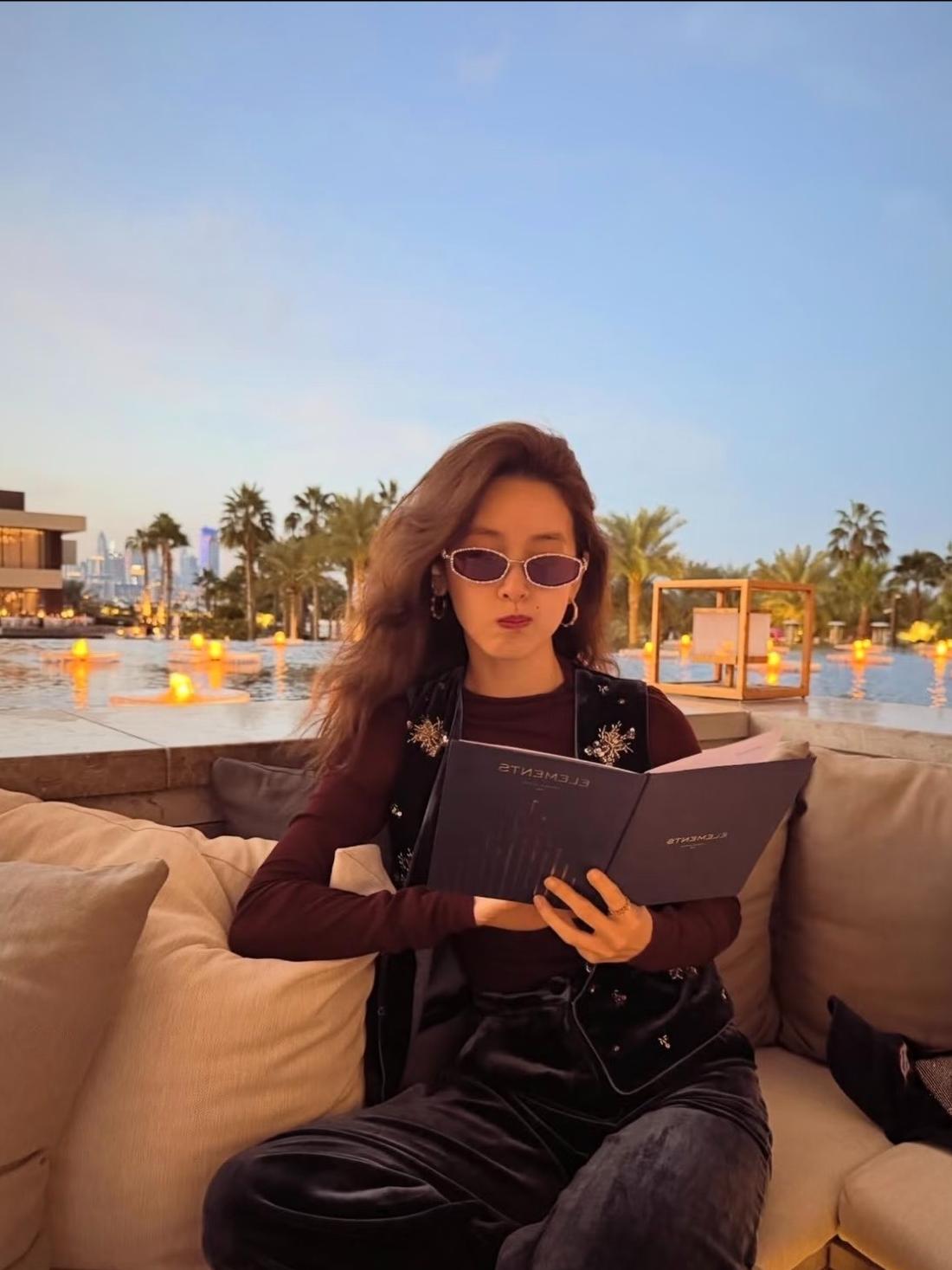 她晒出的书单封面隐约可见《艺术史概论》烫金标题,手边阿拉伯风格铜盘里盛着酒店特制的椰枣甜品。最耐人寻味的是那张插着"18"数字蜡烛的蛋糕照片,配文"今年的18岁过得好快",让人想起一个月前她素颜庆生时穿的oversize针织衫。迪拜的奢华背景与这种自嘲式幽默形成的反差,恰恰成了当代网友最买账的"凡尔赛"新范式。