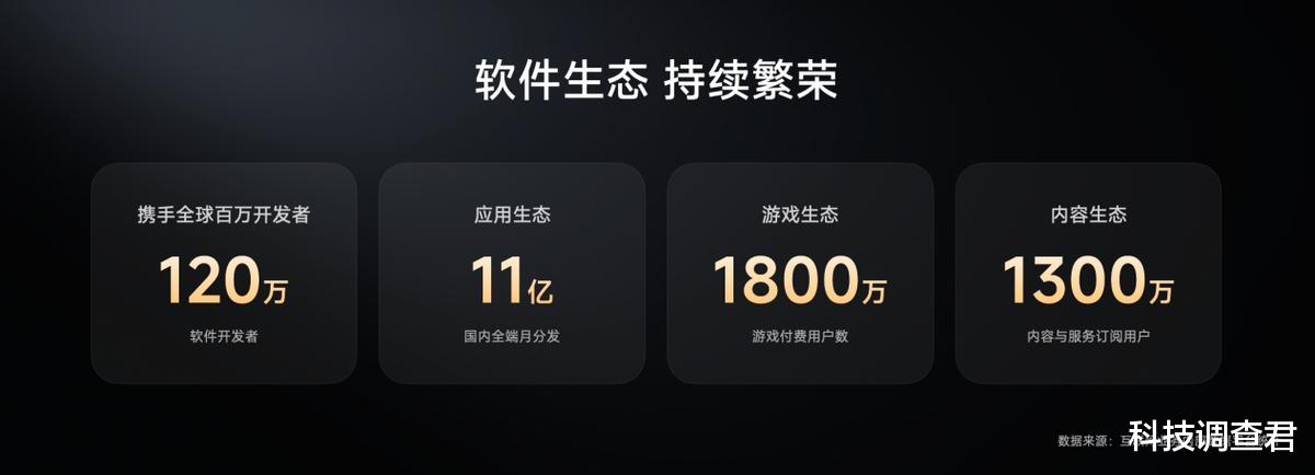庞大的用户规模带动小米软件生态持续繁荣。据本次大会披露,小米软件开发者数量目前已达到120万,小米应用生态的国内全端月分发量突破11亿,其中游戏生态的付费用户数突破1800万,内容生态的订阅用户数突破1300万。去年生态大会上推出的“人车家全生态”完美适配项目,已有50+开发者达成多终端完美适配意向。