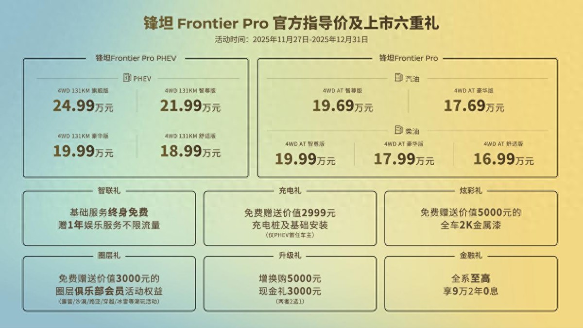 11月27日,日产全球皮卡中国首发!潮玩由NI,尽在锋坦!发布会上,郑州日产公布了锋坦的官方售价:锋坦Frontier Pro售价区间16.99万元-19.99万元,锋坦Frontier Pro PHEV售价区间18.99万元-24.99万元。为回馈用户支持,郑州日产还同步推出“智联礼、充电礼、炫彩礼、圈层礼、升级礼、金融礼”尊享6重礼,助力广大用户轻松购、放心开。
