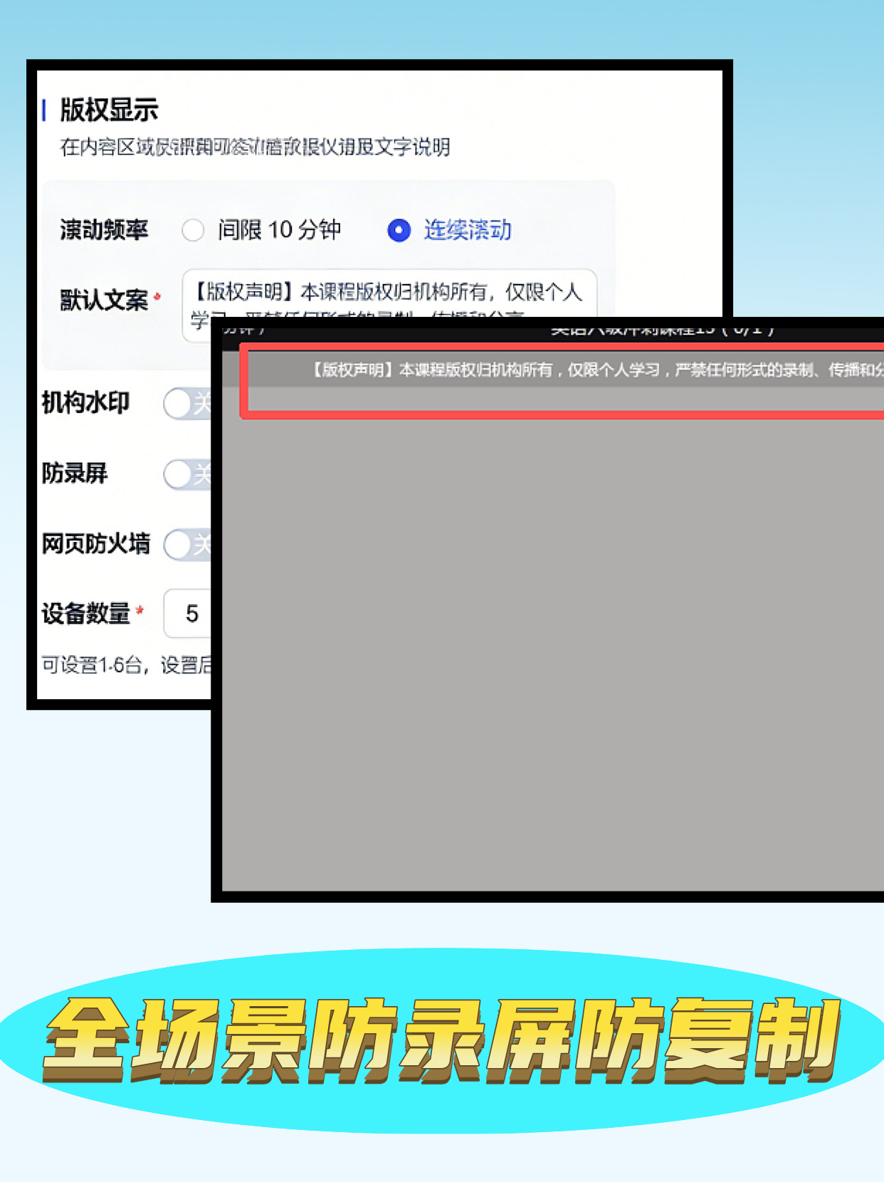 针对常见的盗录、搬运行为,这款工具搭建了多层防护体系。无论是系统自带的录屏功能,还是第三方录屏工具,都能被精准识别并触发黑屏拦截,让盗录内容无法正常生成。对于图文课件,还能禁用右键复制、图片保存功能,从源头避免内容被简单复制搬运。同时,搭配H5防护墙功能,限制课程仅能通过官方APP或客户端观看,切断网页端破解的风险,进一步筑牢防护防线。