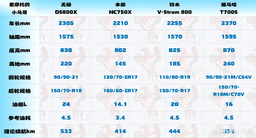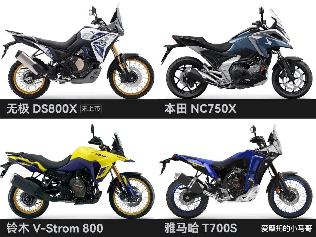 从侧面棚拍图就能清晰看出四款车的定位:本田NC750X更像带了点ADV基因的通路街车,没啥越野气息;铃木V-Strom800是标准的拉力造型,但野性程度比无极和雅马哈差了点意思;雅马哈T700S虽然风格相近,但无极的辨识度明显更高。不过颜值这东西终究是千人千面,对于真正的越野玩家来说,实力才是硬道理!