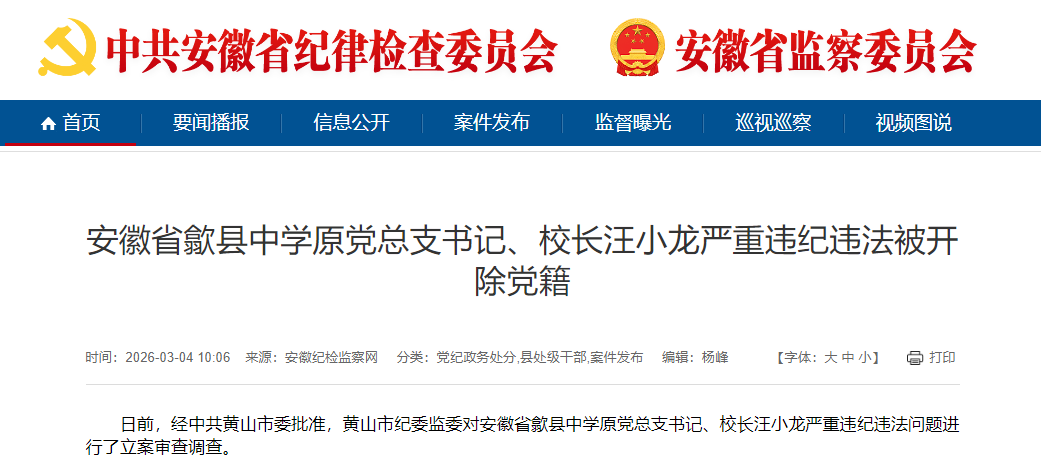 公元二〇二五年九月三十日,适值中秋国庆双节前夕,黄山市纪委监委忽发通报:汪小龙涉嫌严重违纪违法,接受纪律审查和监察调查。其重返教育未满六载,即告梦碎。公元二〇二六年三月四日,经黄山市委批准,市纪委监委详查其罪,谓其严重违反党的政治纪律、廉洁纪律,构成严重职务违法并涉嫌受贿犯罪,且在党的十八大后不收敛、不收手,性质严重,影响恶劣。遂开除其党籍,取消所享待遇,收缴违纪违法所得,并将其涉嫌犯罪问题移送检察机关审查起诉。四十一年之浮沉,自讲台始,至囹圄终,可悲可叹!