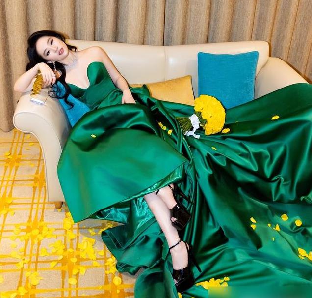 刘亦菲身穿一身气质优雅的绿色深V礼服,长发披肩,让人惊叹于她的不老容颜和依然仙气飘飘的外貌。