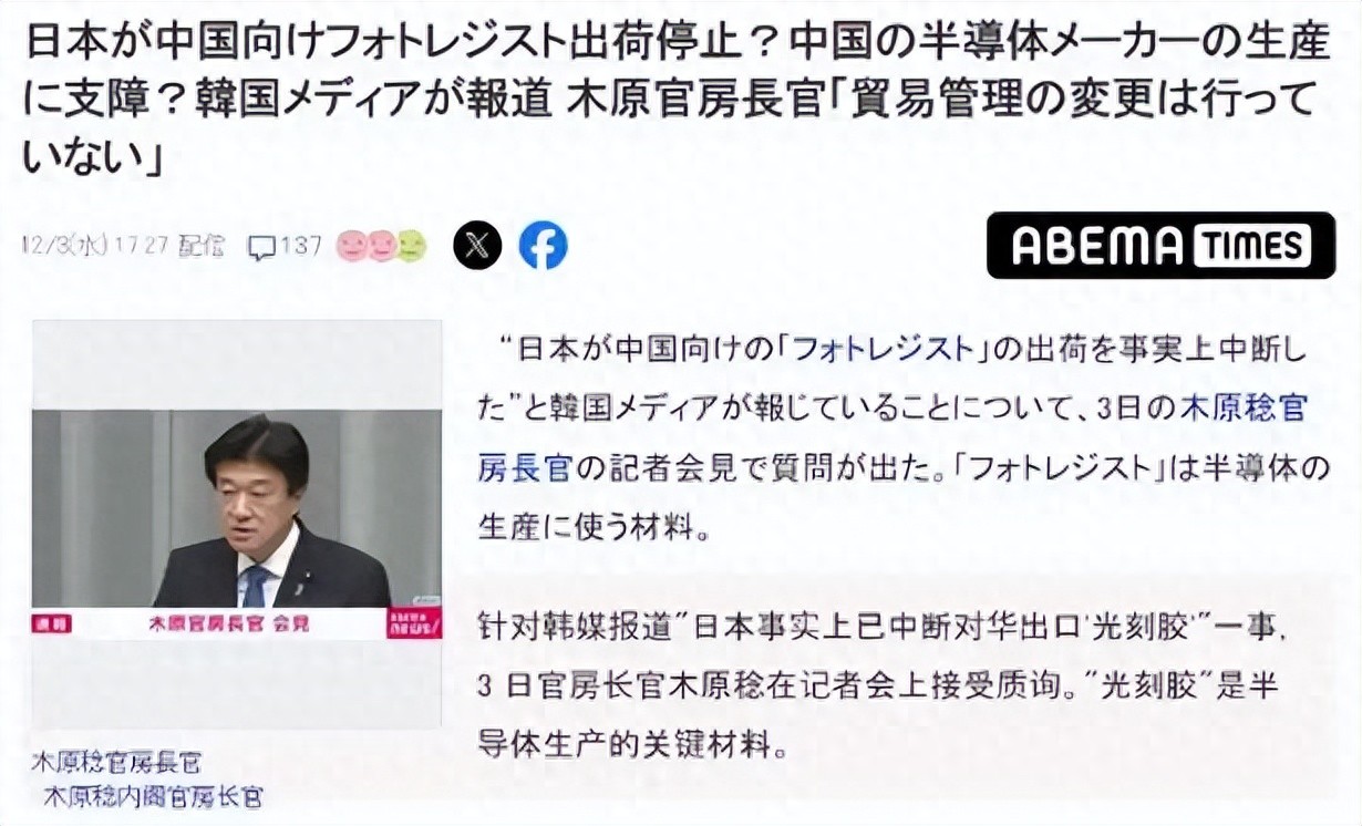 “没有断供,贸易政策也未改变”,12月3日日本内阁官房长官木原稔的公开辟谣言之凿凿,为流传甚广的“日本全面停供对华光刻胶”消息画上了官方层面的“休止符”。