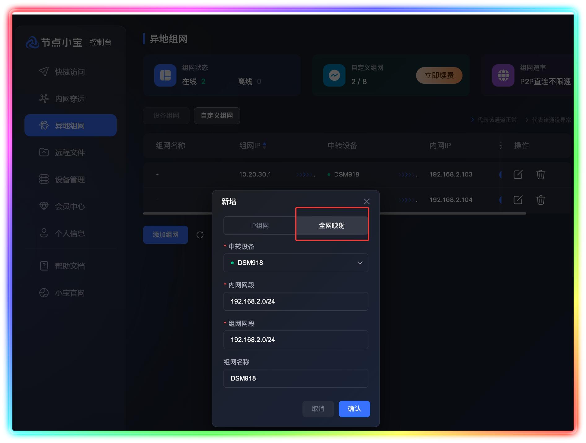 进入 异地组网 -> 自定义组网 -> 添加组网,全部默认即可。
