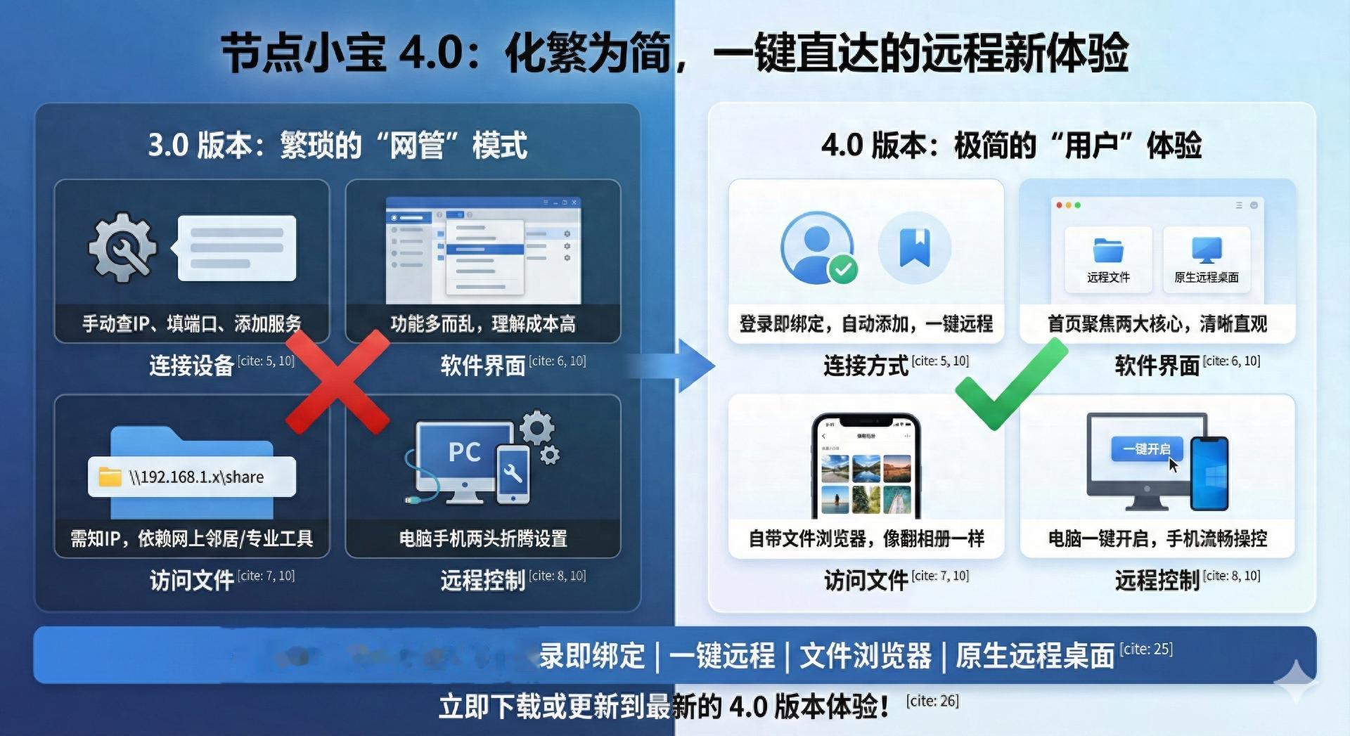 小结总的来说,节点小宝 4.0 通过登录即绑定、一键远程、原生远程桌面等一系列革新,成功将远程控制从“专业技能”转变成了“日常便利” 。如果你正受困于复杂的网络设置,或者正在寻找更高效的远程工作流,不妨期待下即将发布的节点小宝 4.0 。