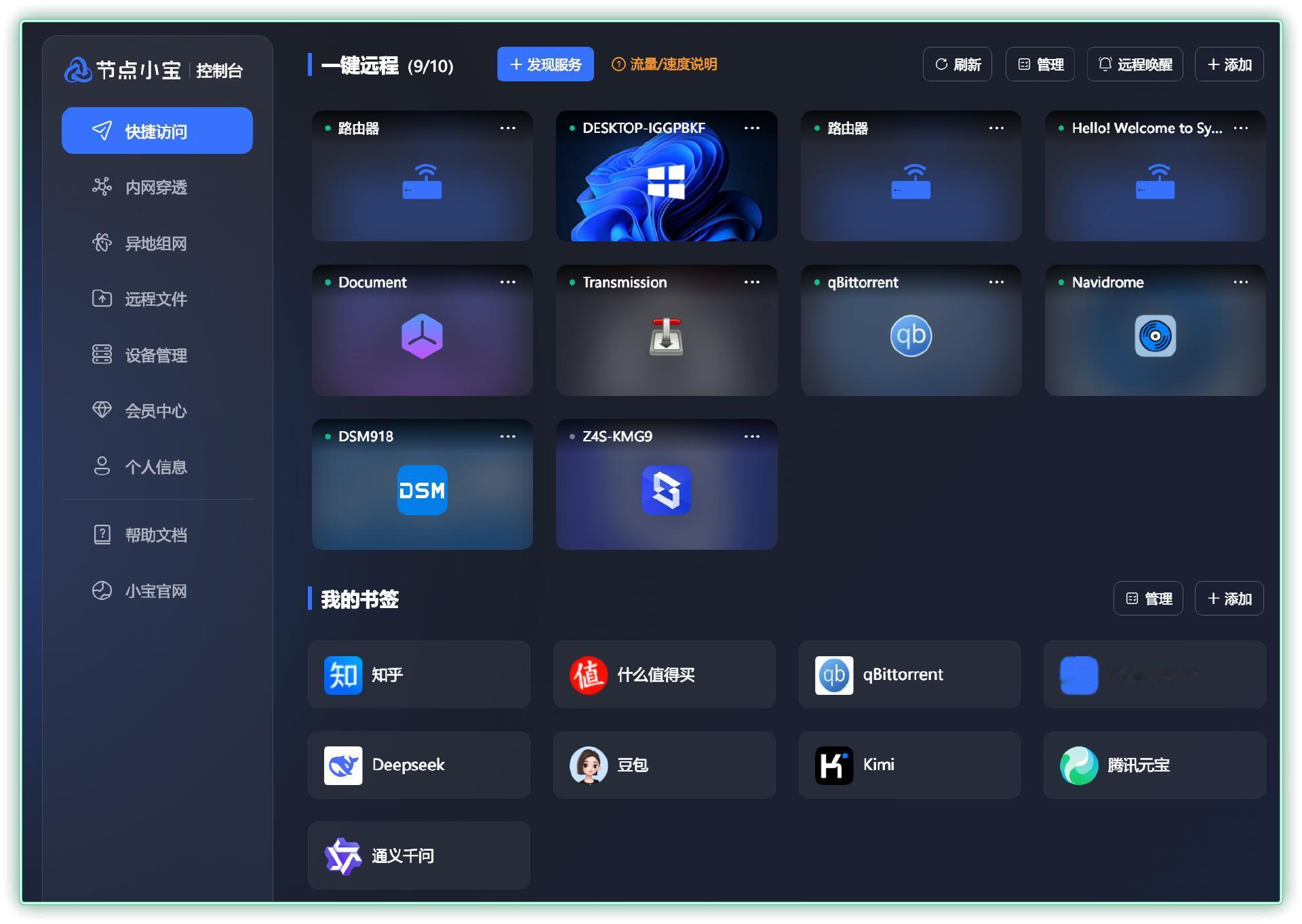 但节点小宝 4.0 彻底改写了这个流程,只需登陆账号,软件即可自动识别并绑定内网中的常见设备和服务 ,新手完全无需了解什么是内网 IP 或端口映射,只要登录账号,所有设备像浏览器书签 一 样排列,一点即连 ,主打个轻松上手。