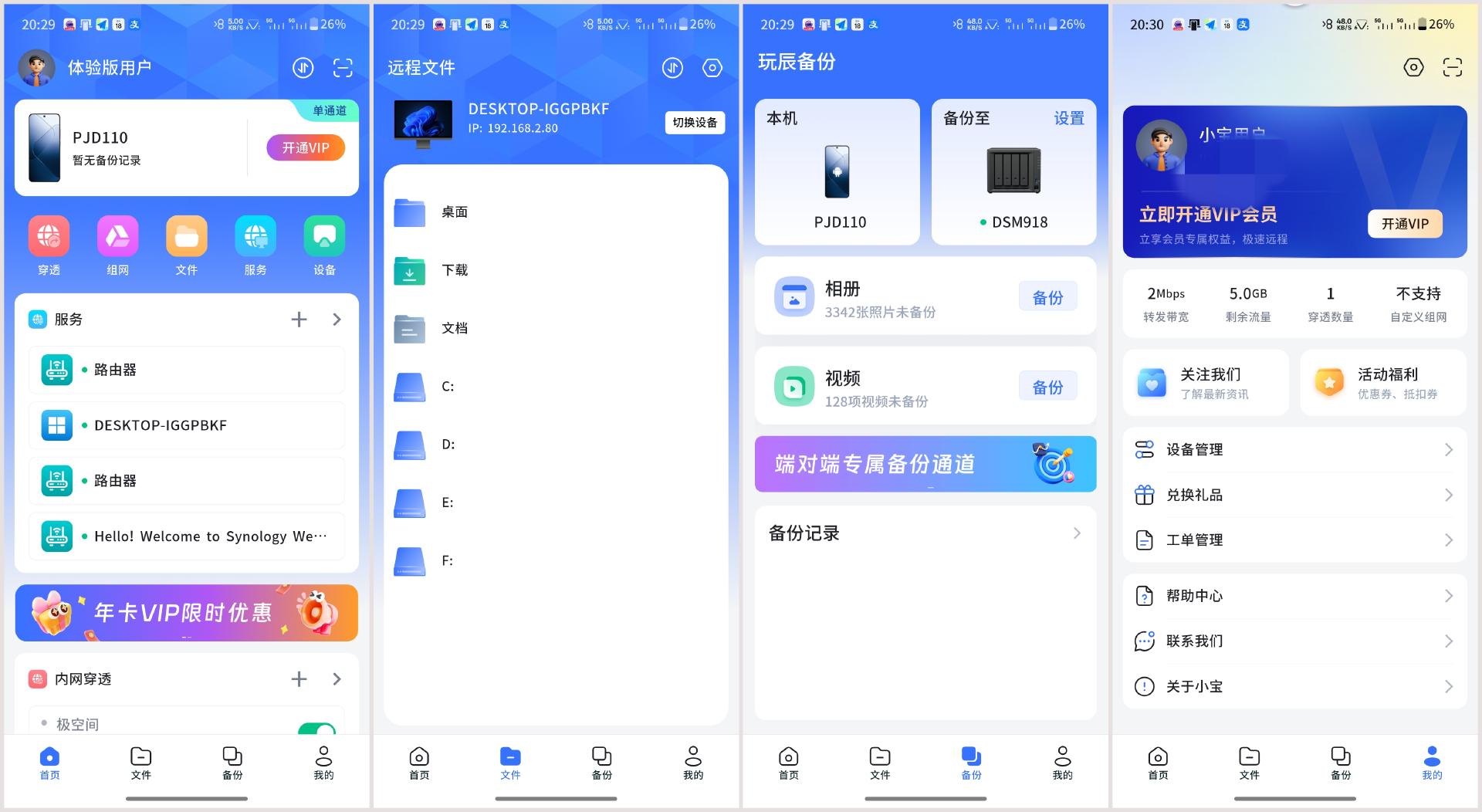 ▼手机端分为四个板块,分别对应功能模块、远程文件、文件备份和个人设置