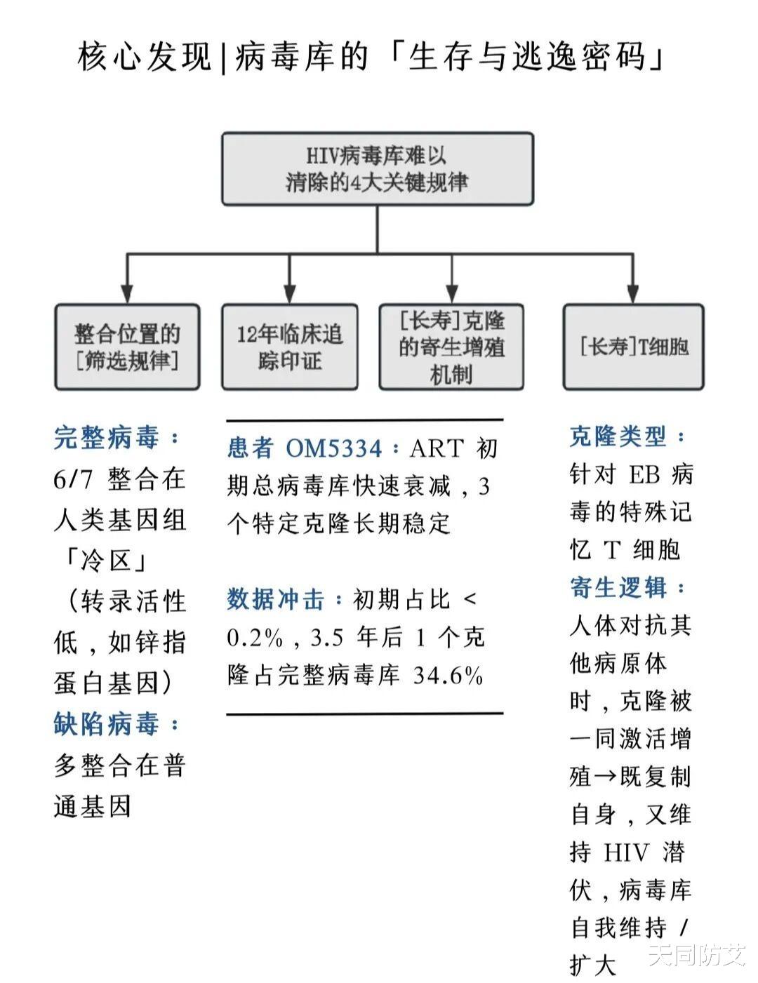 研究中最让人震惊的发现是:这些携带 HIV 的 CD4+ T 细胞竟然拥有针对其他病毒(如EB病毒)的免疫应答能力。这意味着什么?每当你的身体调动免疫系统对抗 EB 病毒时,潜伏的 HIV 克隆细胞也会被一同激活,趁机增殖。病毒在利用你对抗其他敌人的机会,扩大自己的"地下组织"。