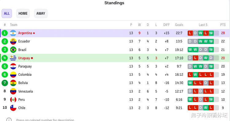 本场比赛过后,阿根廷继续排名南美区的榜首,领先第二名厄瓜多尔的优势来到了6分,乌拉圭最近7轮1胜4平2负,暂列第四。