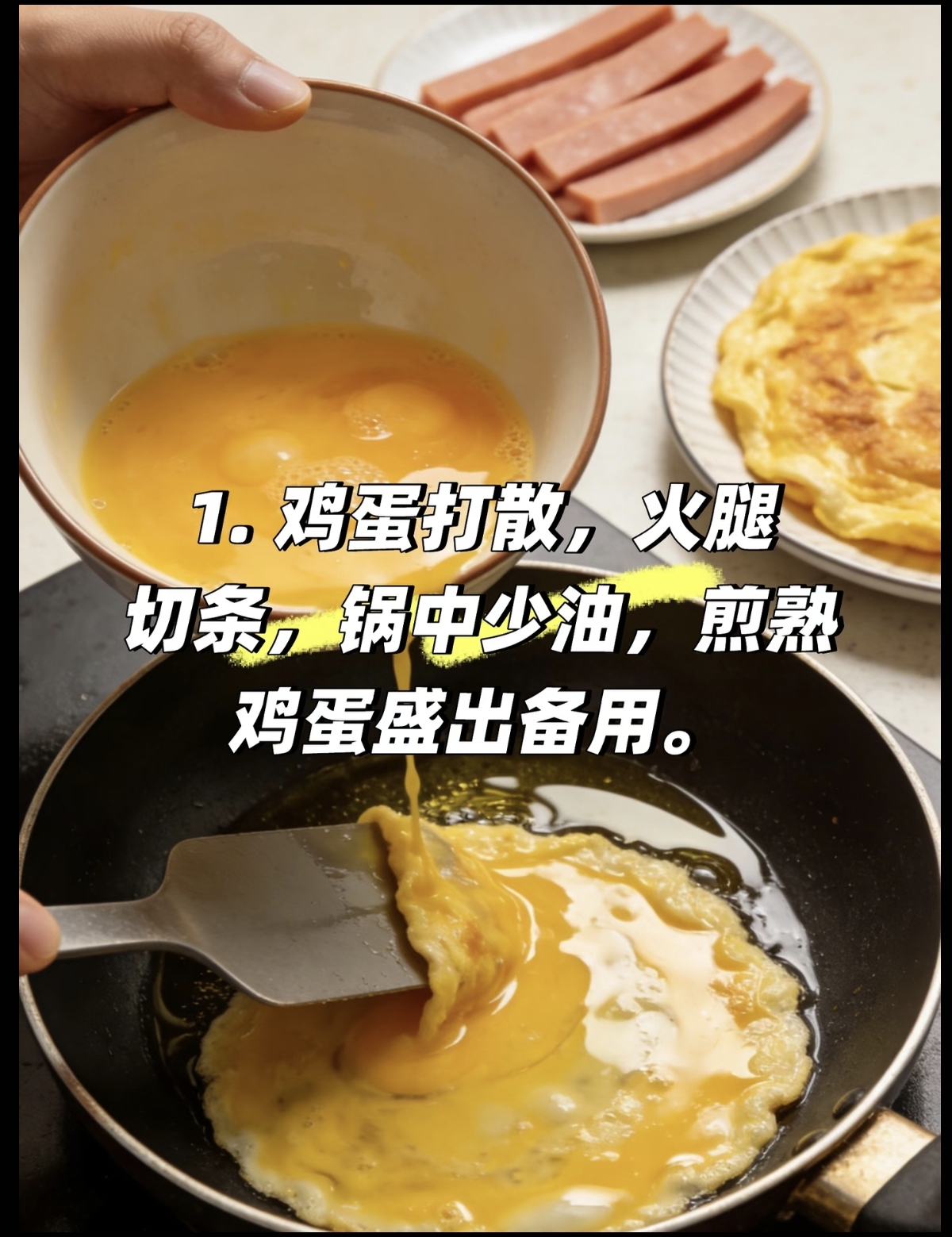烹饪的序曲从煎制荷包蛋开始。热锅凉油,待油温升至五成热时,将打散的蛋液缓缓倒入,用筷子快速划散,炒成金黄蓬松的鸡蛋块,盛出备用。这一步看似简单,却决定了鸡蛋最终的口感,火候的把控至关重要,既要保证鸡蛋熟透,又要避免炒得过老而失去嫩滑。紧接着,利用锅中余油,放入火腿片,中小火慢煎至两面微微焦黄。火腿的油脂在高温下被逼出,与锅底的香气融合,为后续的焖煮奠定了浓郁的底味。