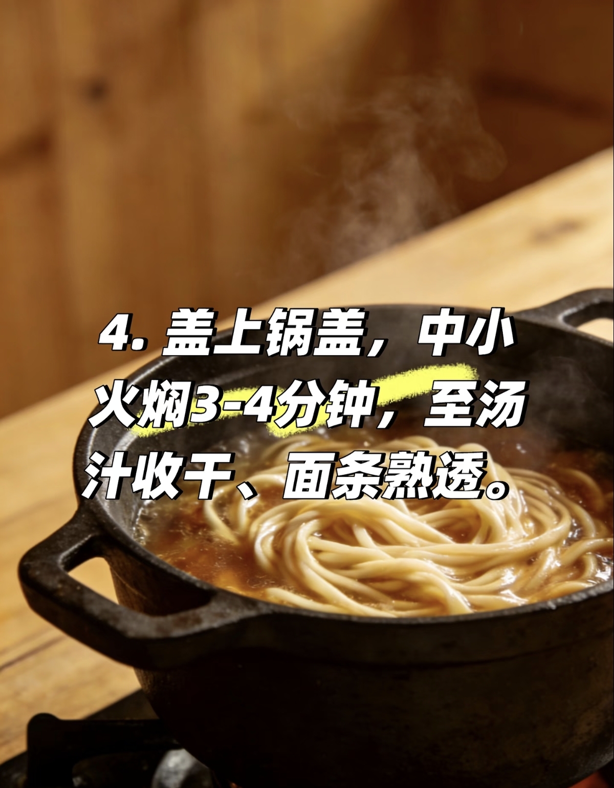 调味的环节是赋予焖面灵魂的关键。将生抽、老抽、蚝油、少许白糖和盐在碗中提前混合均匀,然后沿着锅边缓缓淋入。老抽的加入为面条染上诱人的酱色,生抽和蚝油则提供了咸鲜的底味,白糖则巧妙地平衡了整体风味,使其更加柔和。随后,倒入适量清水,水量以刚好没过面条为宜,盖上锅盖,转中小火开始焖煮。焖煮的过程是食材相互融合、味道渗透的关键阶段,面条在蒸汽的作用下逐渐变得柔软,同时贪婪地吸收着火腿、鸡蛋和酱汁的精华。