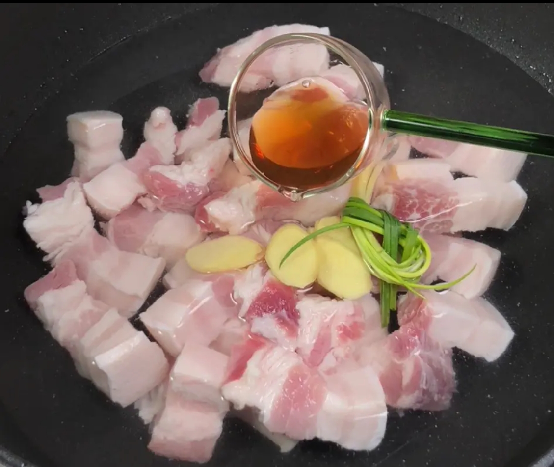 1. 处理五花肉:五花肉切成约3厘米见方的块状。冷水下锅,加入姜片和料酒,大火煮开焯水2-3分钟,撇去浮沫。捞出后用温水冲洗干净,沥干水分备用。