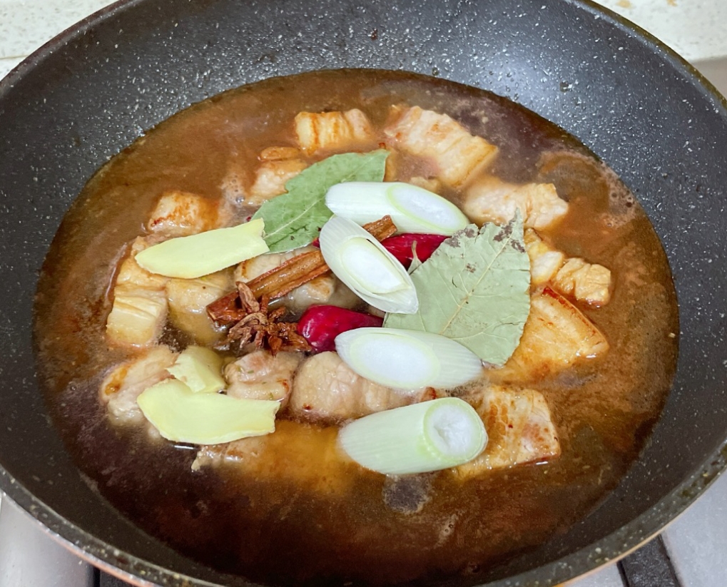 随后,便是慢炖的艺术。加入葱姜、八角、桂皮、香叶等香料炒出香味,再倒入足量的开水,没过所有食材。大火烧开后,转为小火,盖上锅盖,让时间去完成最后的魔法。一个钟头的慢炖,是这道菜的精髓。正如古人所言,“慢着火,少着水,火候足时他自美”。在这期间,肉块在汤汁中慢慢变得酥软,肥肉中的油脂逐渐析出,与酱汁融为一体,瘦肉也吸饱了汤汁,变得鲜嫩入味。整个过程,都弥漫着一种令人安心的、家的烟火气。