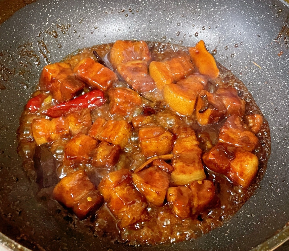 4. 收汁出锅:炖至肉质软烂,用筷子可以轻松插入时,开大火收汁。期间需不停翻炒,防止粘锅,直到汤汁变得浓稠,红亮的酱汁紧紧地包裹在每一块肉上即可出锅装盘。
