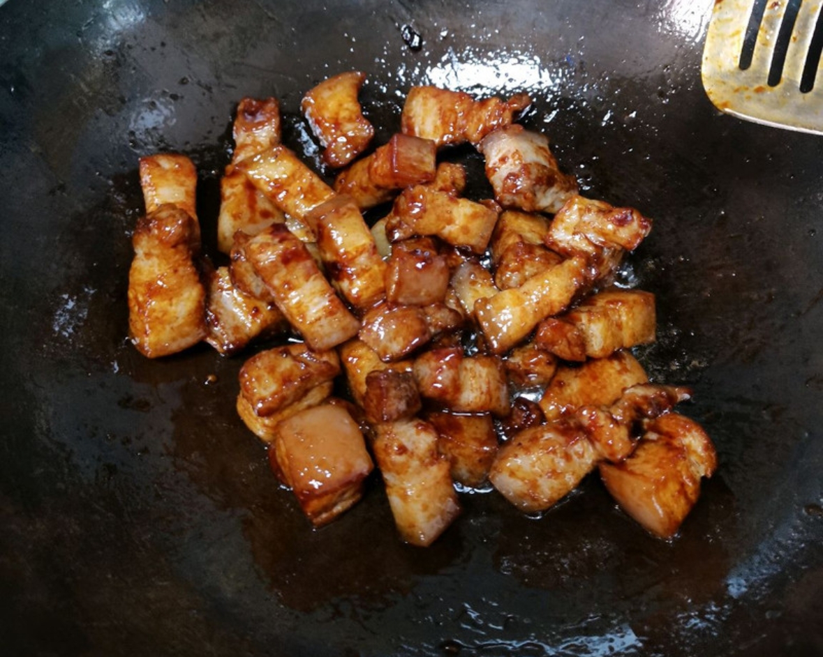 2. 炒糖色:锅中放少许油和冰糖,小火慢炒至冰糖完全融化,颜色变为深枣红色并冒起细密小泡。迅速倒入焯好水的五花肉块,快速翻炒,使每一块肉都均匀裹上糖色。