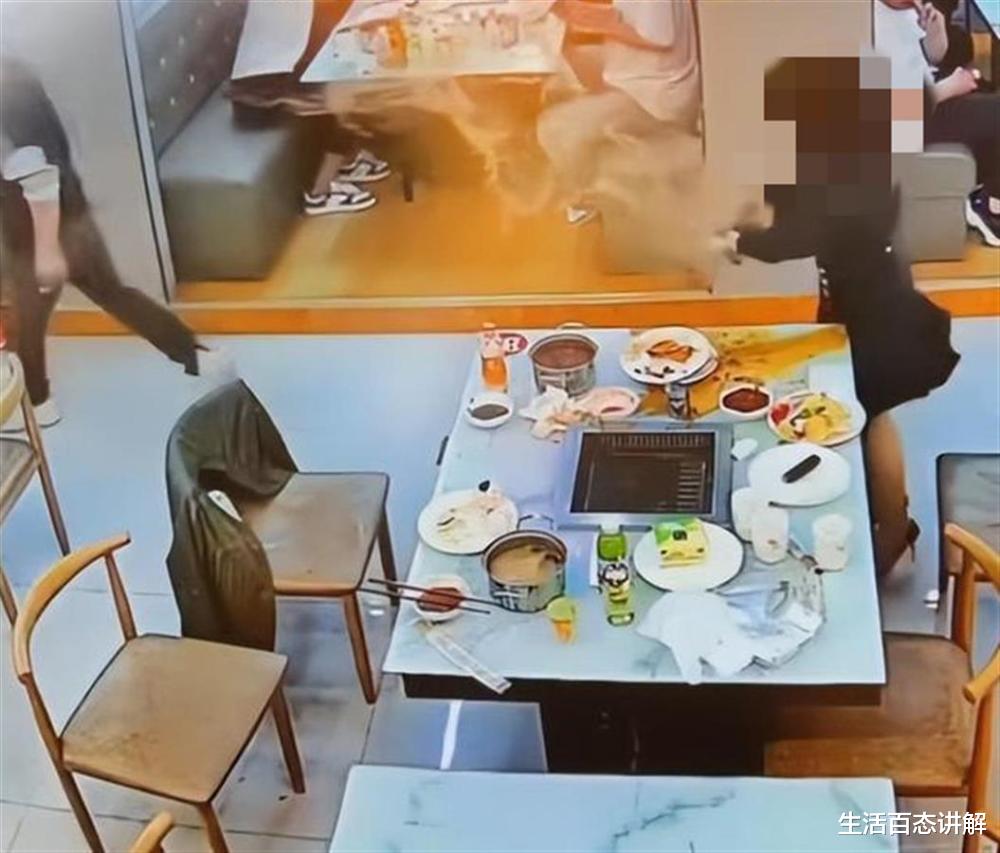店内监控视频显示,起初一名女子和一名男子及一名孩子正在吃火锅。期间,女孩离开餐桌后,不知何故,女子先将餐盘里的食物扔向男子,男子随后起身离开餐桌,女子随后将一小盆火锅泼向男子。因为男子跑开了,火锅汤大部分泼到了地上,但有汤水溅到了邻桌的客人身上。