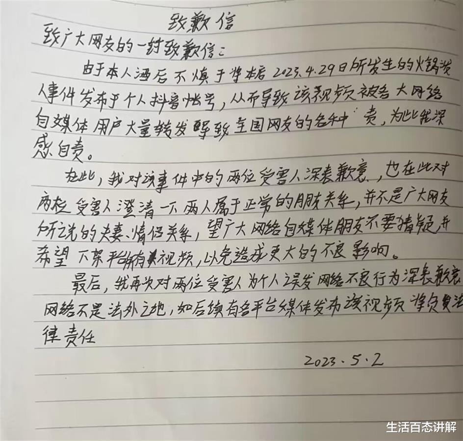 视频发布者是店内的员工,他告诉极目新闻记者,视频中的两人并不是夫妻,也不是情侣,只是普通朋友,希望网友不要猜疑。视频是酒后不小心误发到网上的,并给两位当事人造成了不好的影响,他对此非常抱歉,并写了封道歉信。因为女子吃火锅时并没有开火,所以那锅汤并不烫。邻桌客人只是衣服鞋子上被溅到了一些油。两人到底因何发生矛盾,他并不清楚。