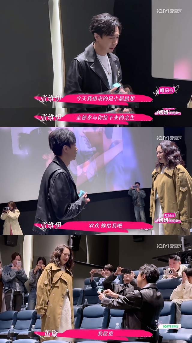 求婚那天,张维伊在影院包了场,叫上自己很多朋友,同时也叫了董璇的闺蜜佟丽娅她们来见证。大屏幕上放出求婚的前奏时,张维伊高举双手托起戒指,转过头泪流满面,止不住的哽咽。