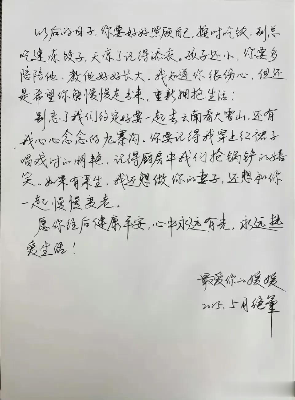 而她留给丈夫辛柏青的绝笔信,更让人泪目:“33年婚姻你把平凡过成诗,来生还嫁你”,字里行间全是对家人的不舍与深爱。