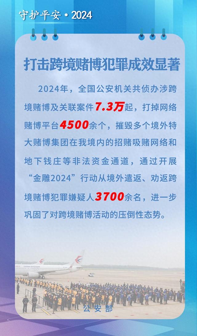 全国公安机关针对45起重大跨境赌博案件开展4波次集群战役,抓获违法犯罪嫌疑人11000余名。重庆公安机关经过3年的缜密侦查和案件侦办,彻底摧毁了长期盘踞菲律宾向我境内招赌吸赌的“DC”赌博集团。中国警方不断深化国际执法合作,持续推进与有关国家联合执法行动,最大限度挤压涉我跨境赌博犯罪空间。去年4月和11月,中柬警方先后两次开展包机押解遣返联合行动,湖北、山西公安机关分批将1200余名中国籍涉赌诈违法犯罪嫌疑人从柬埔寨押解回国。各地通过开展“金雕2024”行动,从境外遣返、劝返跨境赌博犯罪嫌疑人3700余名,包含一批头目、金主和骨干,打击了境外涉我犯罪集团的嚣张气焰。