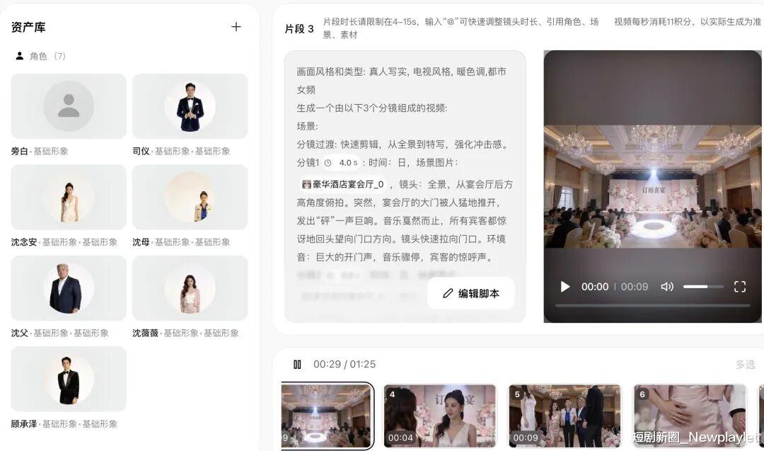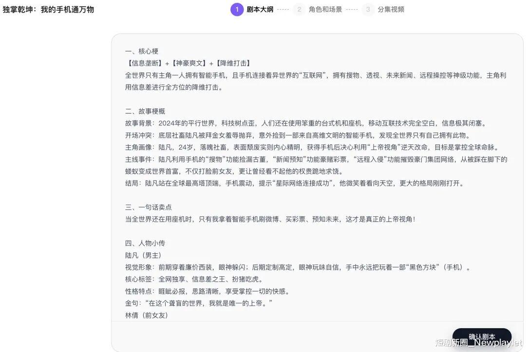 令人惊喜的是,整个蓝图的生成,并不用像之前的AI工具一样一遍遍的抽卡,也不用像之前一样需要翻阅几万字剧本去给角色逐一打标签,小云雀短剧Agent会自动扫描整个剧本故事并做出视频策划。