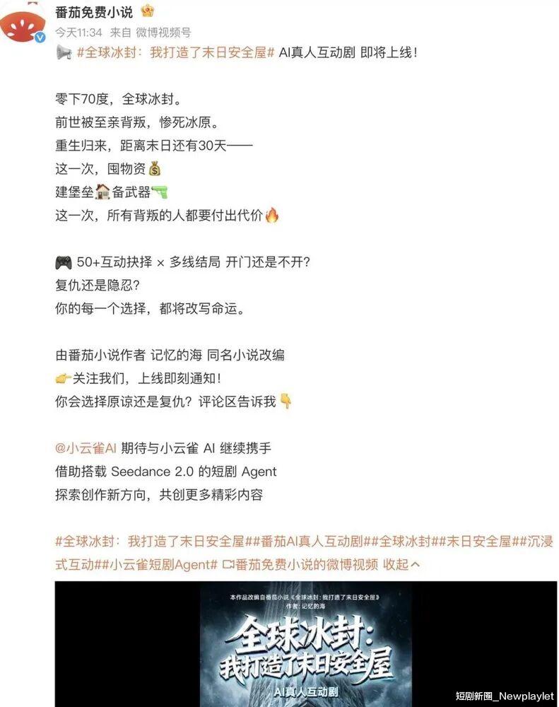 同时,由番茄小说出品、小云雀AI技术支持的AI真人互动短剧《全球冰封:我打造了末日安全屋》也宣布即将上线,其改编自番茄小说作者记忆的海的同名小说,相关PV目前已经发布。