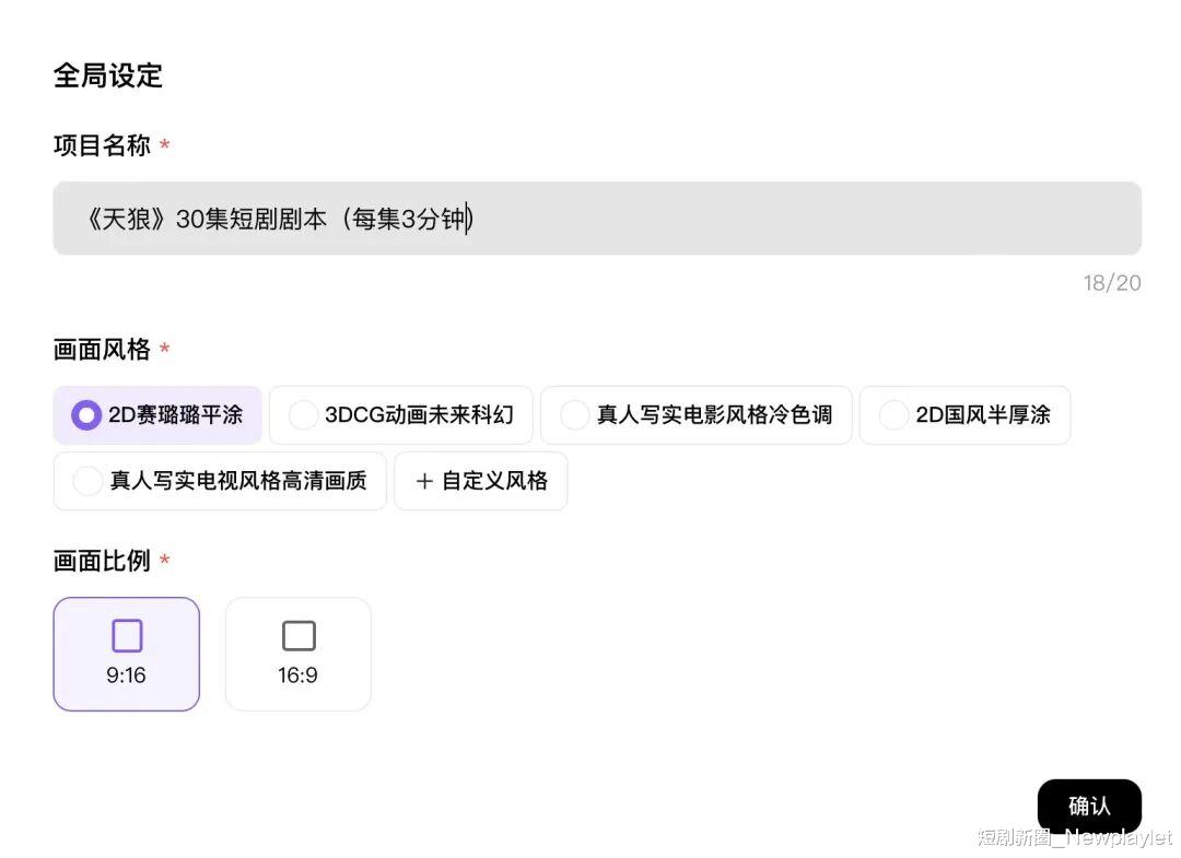 短剧新圈(ID:newplaylet)在测试过程中,将剧本上传之后,紧接着大概1分钟左右的时间,会出现“剧本研读已完成”的绿色标志。接下来,选择自己需要的风格。系统会智能推荐一些,比如2D国风半厚涂、3DCG未来科幻、真人电影暖色调、真人胶片复古调色、2D赛璐璐平涂等,实际可选的画风风格更多。
