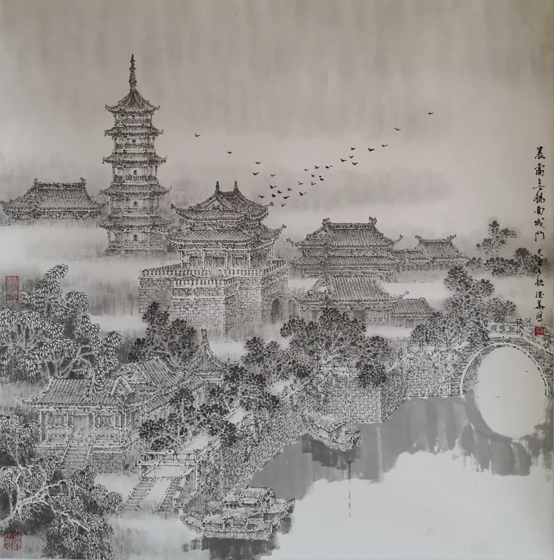 德华还非常注重传承和创新。他深知界画这一传统画种在现代社会中面临的挑战和困境,因此不断探索新的表现形式和技法,撇弃工具,运用勾点积线,以硬朗古拙笔墨取形,力求让其焕发新的生命力,并力主更其名曰“楼阁画”。在他的作品中,我们可以看到传统与现代的完美结合,既有古建筑的韵味,又有现代审美元素的融入。这种创新精神让他的作品具有独特的魅力和艺术价值。由此他的作品多次人选全国美展并获奖,九十年代就加入了中国美术家协会,许多专业出版社出版了他有关亭台 楼阁技法专著,这无疑是对这一传统画种的推广和发扬。
