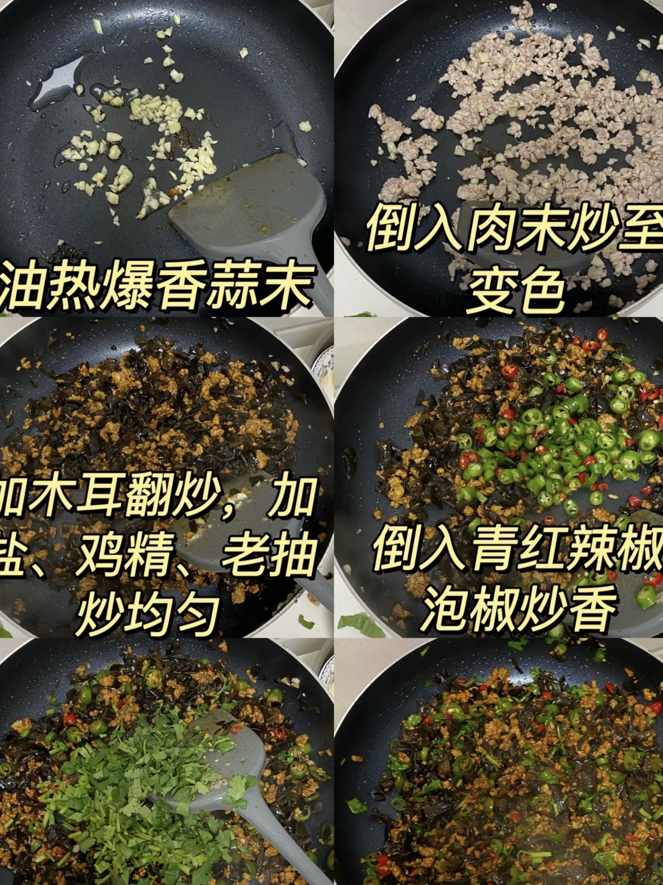 把木耳沥干水分,倒进锅里和肉末会师,大火翻炒三十秒,木耳遇热“噼啪”作响,像在给锅子鼓掌。来半勺老抽上色,让木耳穿上酱红外衣;一小撮盐和鸡精,提鲜不抢味;最关键的是泡椒,带着酸辣的钩子,把整锅味道拉向“川味宇宙”。