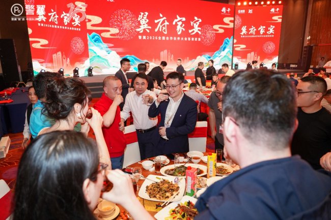 随着白天议程的圆满结束,夜幕下的“翼府家宴”拉开帷幕。这不仅是一场庆功宴,更是一场属于警翼与合作伙伴的家人团聚。宴会上,警翼隆重颁发2025年度优秀合作伙伴奖项,致敬每一位在奋斗路上笃行不怠的同路人。鎏金酒杯频频举起,真挚祝福声声相传,在美食与美酒的相伴中,大家卸下疲惫,敞开心扉,共同铭记这一荣耀与温情并存的夜晚。