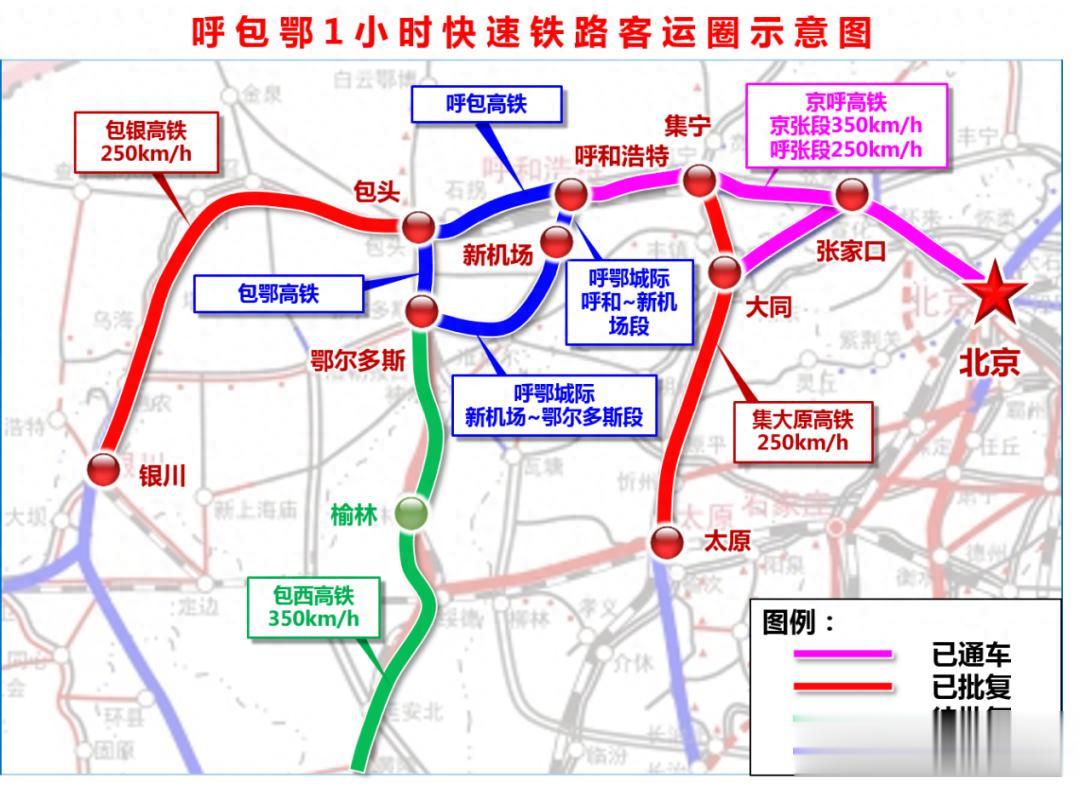 项目建成后,对外可打通呼包鄂城市群时速350公里南下高铁大通道,将呼包鄂城市群深度融入国家高铁网,快速通达京津冀、西安、成渝、长三角等发达地区城市圈,对内可以形成呼包鄂榆城市间1小时快速城际圈,满足区域城市间旅客快速通达需求。