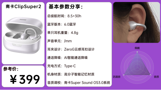 这款南卡ClipSuper2是现在开放式、耳夹式耳机里讨论度很高的一款。南卡本身就是做开放式耳机起家的老牌厂商,在这个领域深耕了十多年,技术底子很扎实。它不靠噱头宣传,主打的就是舒适佩戴和真实听感,在同类产品里一直口碑很稳。也正因为产品力够硬,南卡的开放式耳机不仅在国内受欢迎,也卖到了欧美市场,还拿过央视推荐和多国认证,在耳机圈里属于“懂的人都会选”的品牌。