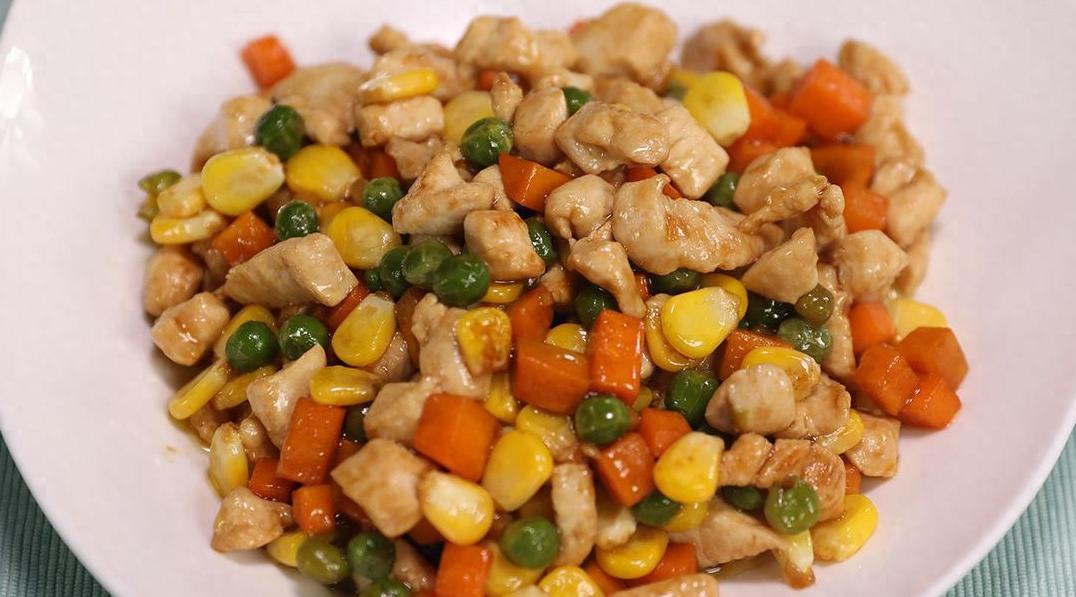 锅中热油,鸡丁快速翻炒变色,接着把五颜六色的配菜青豆、玉米粒和胡萝卜丁一股脑倒进锅里。