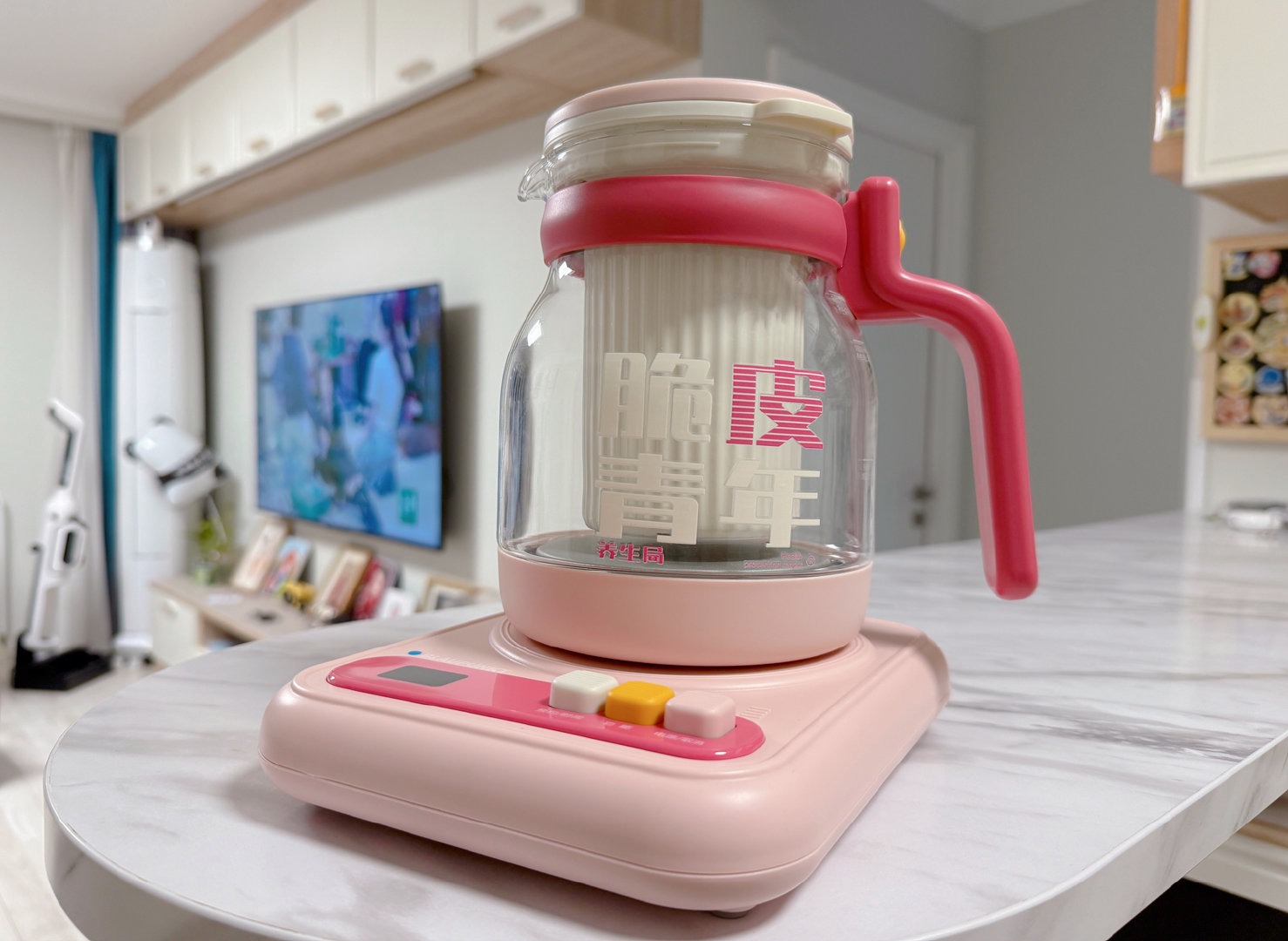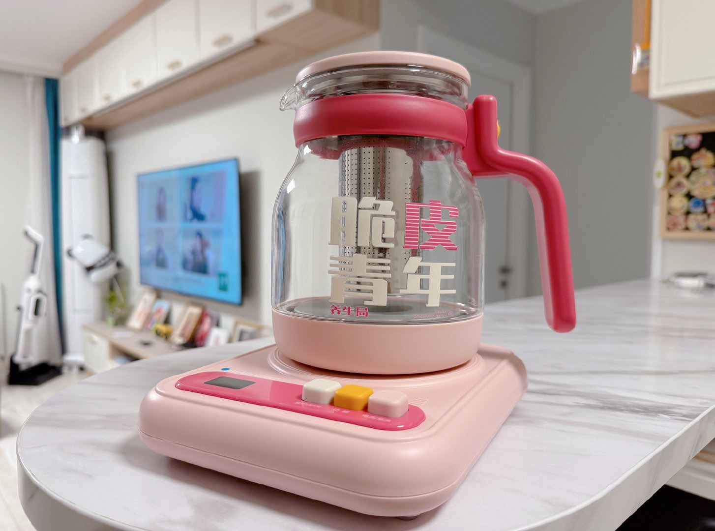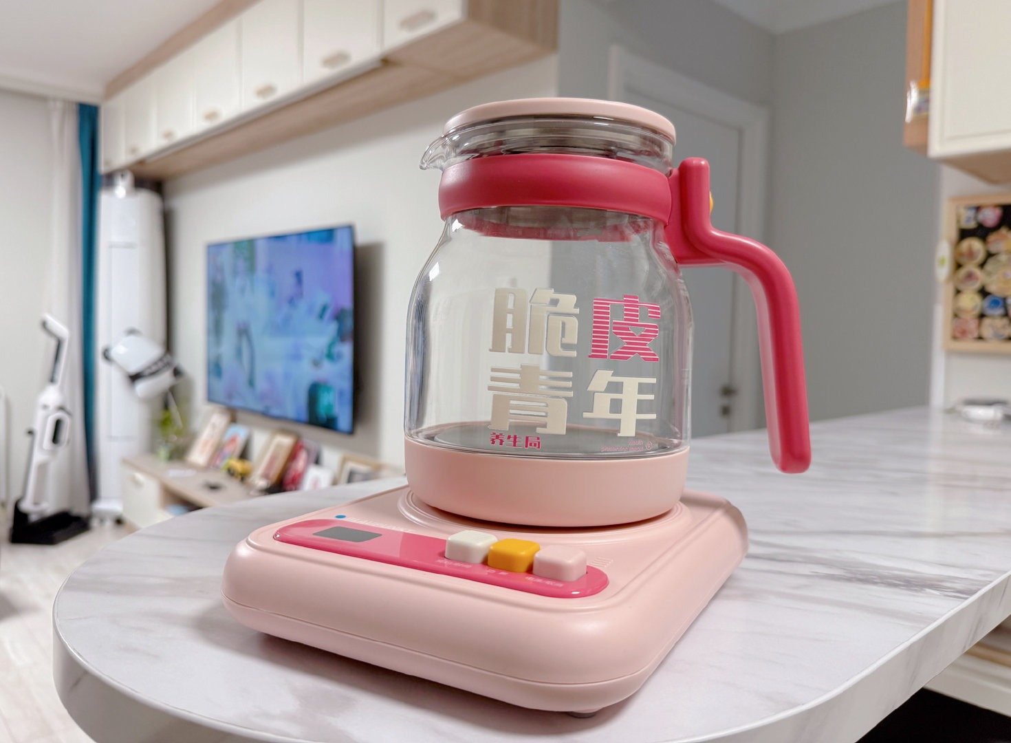 壶身采用透明的食品级高硼硅玻璃,不仅耐高温,还能让我清楚地看到里面煮的东西,这种透明感让我觉得特别安心。“脆皮青年”四个大字印在蓝宝OK泡养生壶壶身,仿佛时刻提醒着我,养生,养生,真的要好好养生。