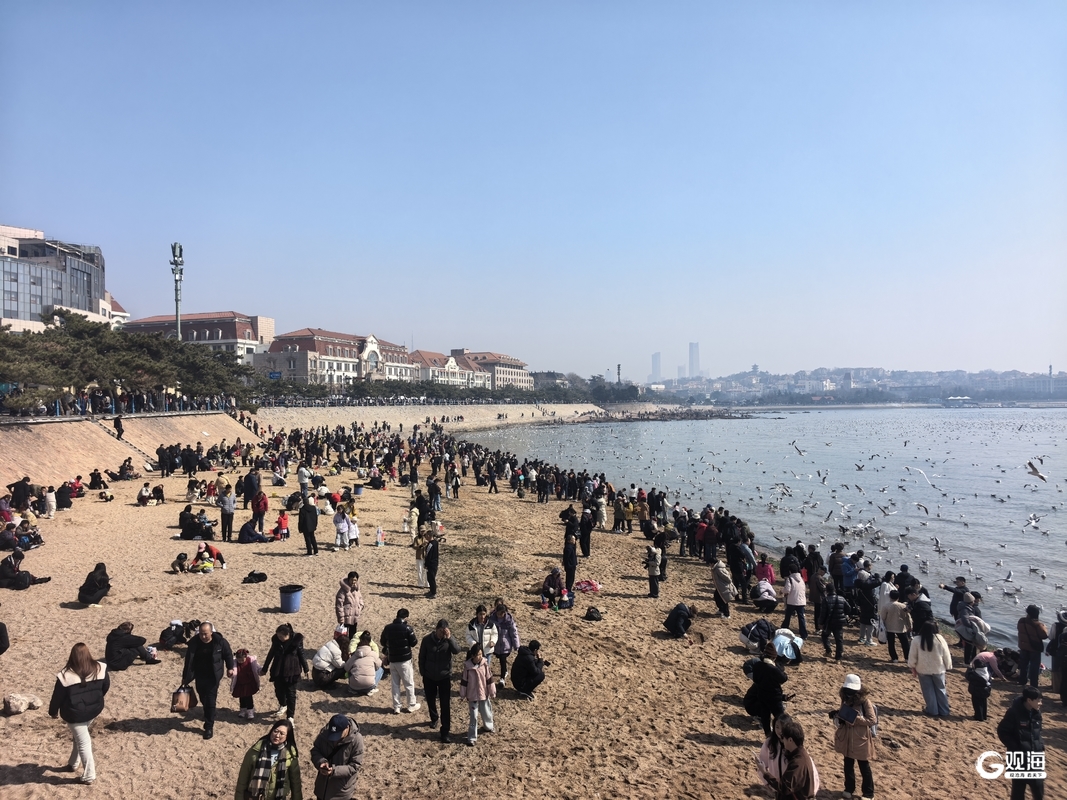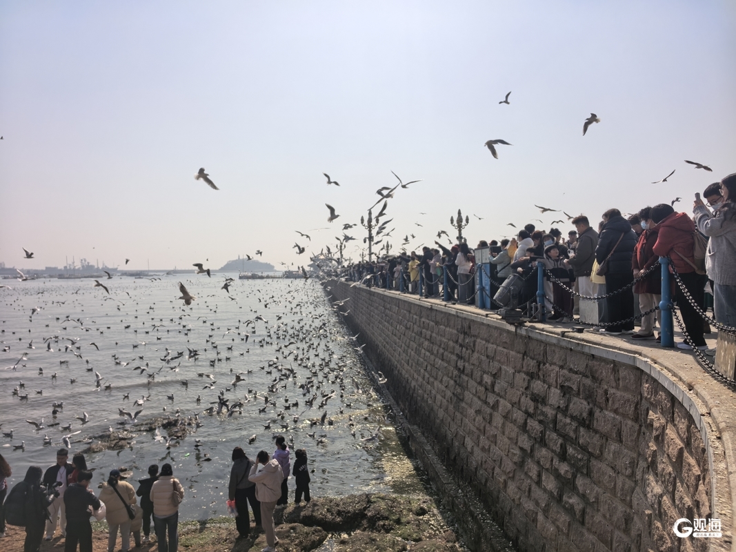 栈桥景区鸥影翩跹、游客熙攘,前海一线被来自全国各地的游客围得水泄不通,大家或在岸上赏鸥喂食,或在沙滩上近距离地和海鸥嬉戏。当海鸥成群飞过,人们纷纷举起相机拍照,定格下这份青岛独有的乐趣和美好回忆。(青岛日报/观海新闻记者 曹森 文/图)