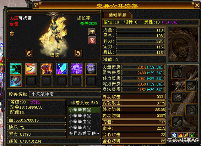 不仅装备够好,这个号的宝宝也是极品——比如5000资质的六耳猕猴。