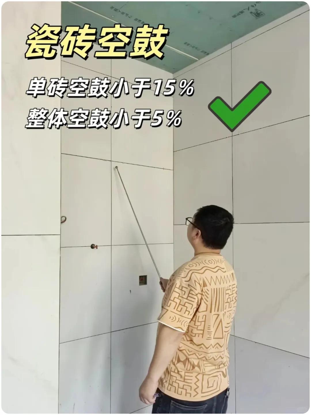 ▲空鼓是允许存在的,看面积大小,空鼓锤全屋敲!单砖空鼓<15%,全屋<5%,能用瓷砖胶贴不用水泥砂浆。
